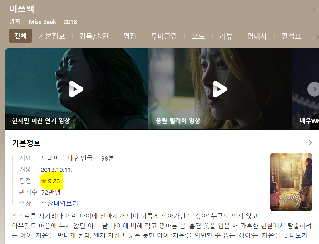 이 영화의 네이버 평점은 9.26점으로, 대중적으로도 작품성면에서도 모두 좋은 평가를 받았구요.